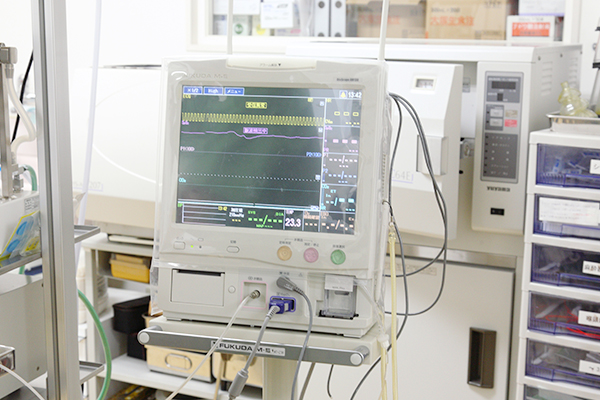 麻酔中の生体情報管理に使用します。各種数値を参考にしてより安全な麻酔管理を行っています。また、救命処置やICU管理にも役立ちます。