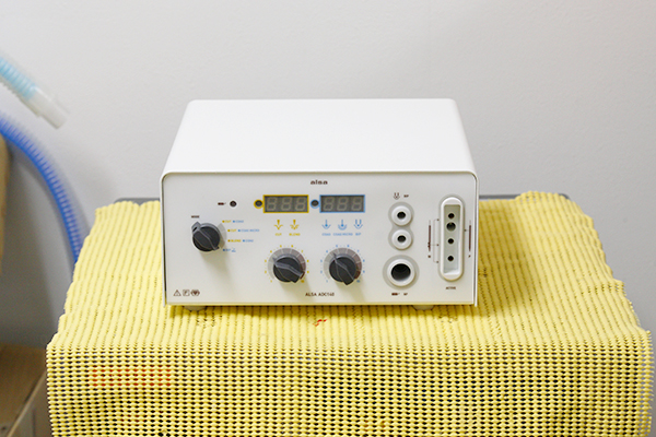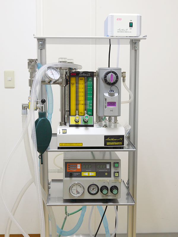 麻酔ガスと純酸素を混ぜて、全身麻酔を行う機械です。人工呼吸器を使用することで安全に呼吸管理が可能です。また長時間の麻酔管理にも対応出来るように酸素と大気のブレンドにも対応しています。