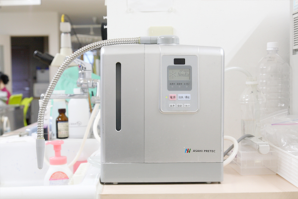 食塩水を特殊な電気分解をして、中性電解水を作る機械です。有効成分は塩素系消毒剤で最も除菌効果が高い次亜塩素酸ですが、消毒薬を用いていないため、舐めても安全な消毒用水です。通常の院内の消毒にはこの中性水を用いています。