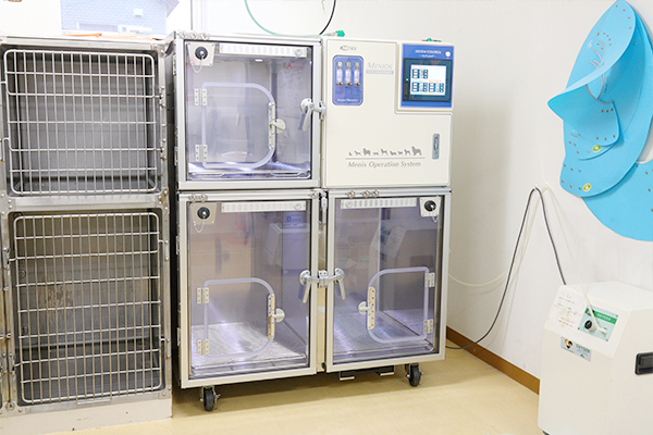 酸素濃度・温度・湿度を管理して治療可能な集中治療室です。最大3頭まで収容可能ですが、下の二部屋を合わせると大型犬も収容可能です。重症疾患の呼吸管理や手術後の覚醒時に用いることで、より安全な麻酔後の覚醒が可能です。